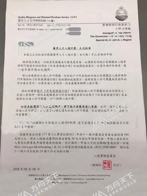 另外准备了公司近五年的盈利资料以及税单,全面的的展示了其任职公司的发展潜力,在香港公司成立之后,可以创造出更多的就业岗位,并且J女士将担任公司的负责人,负责公司的运营及发展,有能力成为推动香港经济发展的优秀人才,所有资料准备完整递交之后,我们时刻关注着客户申请的进度,并且发现在今年,J女士就读的大学已成功跻身世界前一百强,于是方舟文案立即收集其学校的官方证明文件,更新打分表,主动将这些补件递至入境处,在我们的努力以及客户积极的配合下,顺利拿到原则性批复。