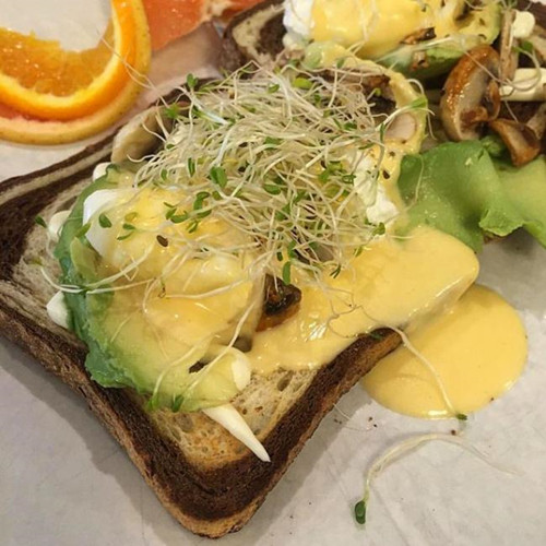 这道菜属于低卡健康风,食材新鲜,低热量,高营养,备受女士青睐。牛油果,蘑菇,奶油芝士,两颗水波蛋,烤黑麦面包片,特制芝士酱与苜蓿芽。选用BC省出品的散养鸡蛋,做出的蛋味特浓,溢出的蛋液为其他食材镀上一层“黄金”;牛油果如奶油般润滑,每一口吃起来都是一种享受;苜蓿芽香气缭绕,口腔中带来一丝凉意;只有蘑菇是加盐调味过的,其他基本都是原味,让这顿早餐吃得清新爽口,无负担。