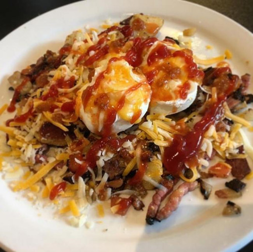 咸味土豆块打底,培根和咸牛肉铺满整盘子,两颗水波蛋在上,蘑菇、西红柿和洋葱做配菜,选用Cheddar和Edam cheese两款口感稍微偏硬,又香又咸的芝士,撒在肉上一同吃,肉味、咸味、嚼劲十足。