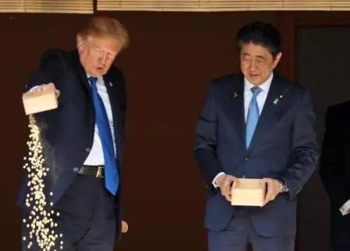 5日,特朗普访问日本期间,和安倍一起喂鱼的“川普式”举动火爆网络,