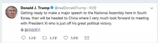 8日,结束对韩访后,川普将抵达中国,今天上午,他发推预告当日行程,“已准备好去韩国国会做重要演讲,随后将动身前往中国,我非常期待会面,他刚刚取得伟大的政治胜利”。