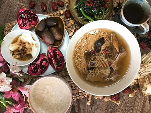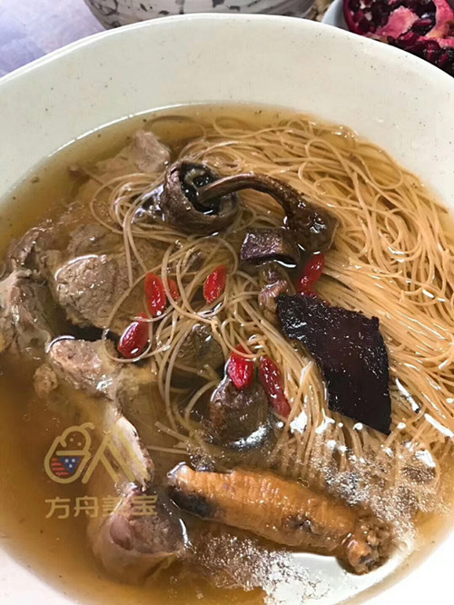 滋补何首乌党参当归松茸菇羊肉汤面线、麻油红苋菜、催奶花生腐竹芝麻汤圆