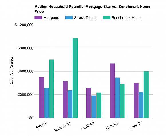 首先,让我们快速回顾一下我们是如何得到25%这个数字的。我们是根据家庭收入中值,以及一地区的房价基准价格来进行计算得出的。加拿大的家庭年收入中位数为69,522加元,在新政策出台前,他们能够从银行借到452,468加元。而如今,在经过压力测试的计算后,这一数字降至335,626加元。
