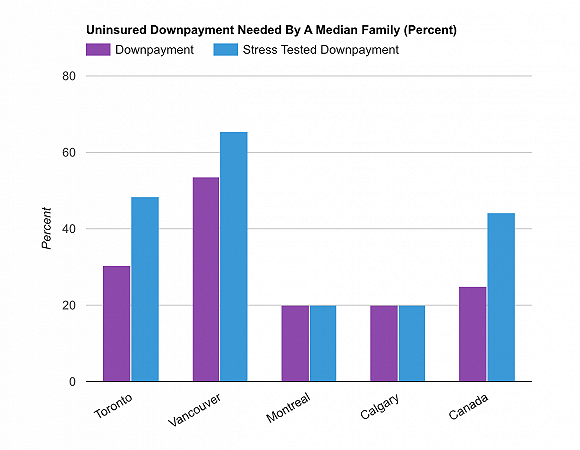 在温哥华,家庭收入中位数为7.2万加元,基准价格为120万加元。对于一个中等收入家庭来说,要在温哥华买一个基准住房,他们现在需要的首付是55万加元。而在压力测试下,这一数字将跃升至67万加元。