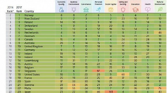 在离开榜首一年后,挪威又回到了排名第一的位置,而且每一个单项指数都排名前八,这个盛产石油的北欧国家拥有世界上最好的自然环境。去年的榜首新西兰尽管在九个类别中有五项都排在二三的位置,且在个人自由方面位居榜首,但在安全与安保的指数中仅排名第二十三。