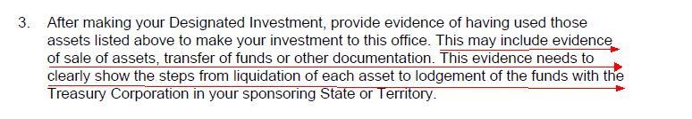 无论是188B还是其他投资移民类别签证,对于投资款的资金出境至今没有一个官方的清晰的说明,以下是188B投资信上移民局对投资款的一个要求,大概说明了一下完成投资后需要递交的证据包括:资产变现出售、转款或其他文件。这些证据必须清晰反映资产从清算到完成担保州的国债认购的每一个步骤。