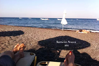 爱琴海畔的黑色沙滩格外的柔软,晒太阳浴、看希腊帅哥、望着爱琴海发呆,其实开心就是这么简单。