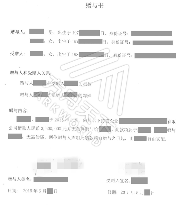 2.赠予声明-证明55万美金是由叔叔婶婶从公司借款出来之后赠予给申请人