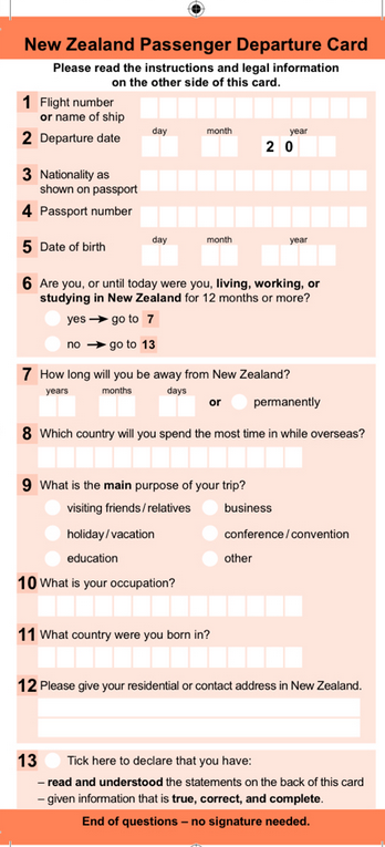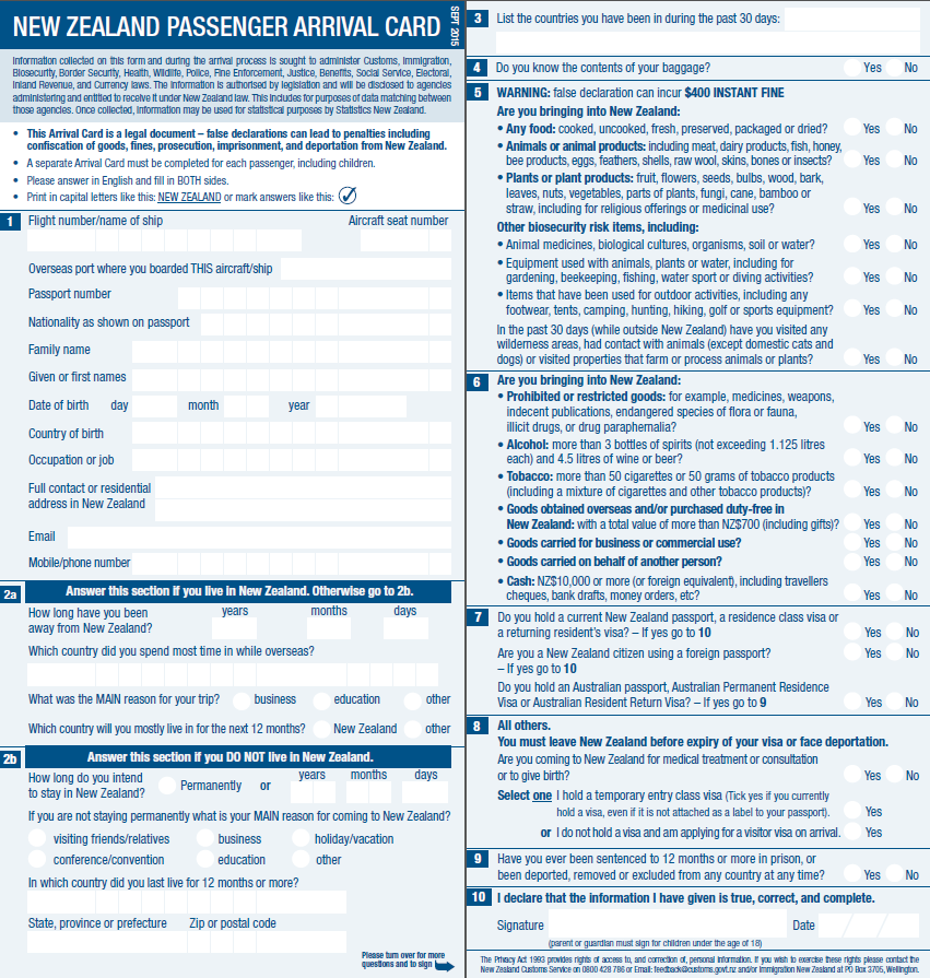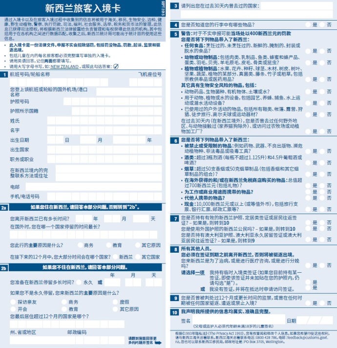 进入新西兰要填写和提交旅客入境卡,填写入境卡时全部要用英文,而且是英文的大写字母。所有的内容也都要如实填写。