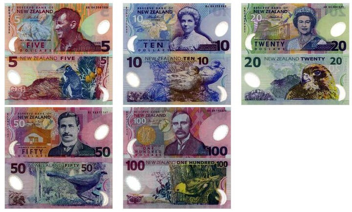 新西兰通用纸币和硬币,1新西兰元等于100分。