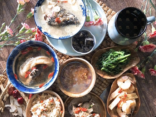 【方舟美宝】今日台式月子餐食:通草鲫鱼催奶汤、香菇野生竹笙乌鸡汤、五彩养身饭、麻油酒香黄芪烩鲜虾、苦茶油拌清菜、八宝红糖粥,排水去湿月子饮、芝麻糖、麻油猪肝(一位麻麻的量)