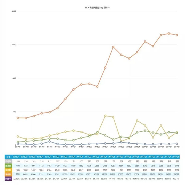 移民局刚刚公布了最新一个季度,2018财年第一季度(2017年10月1日至12月31日),EB-5案件递件和审批数据。I-526申请数量,再次走高。