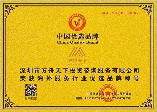 入选中国优选品牌绝不是方舟天下的终极目标,而是未来新的起点,方舟天下将携手中国优选品牌,为打造最优质的移民服务而奋斗。选择方舟天下,相信品牌的力量,助力您的移民梦想,成就第二次人生!