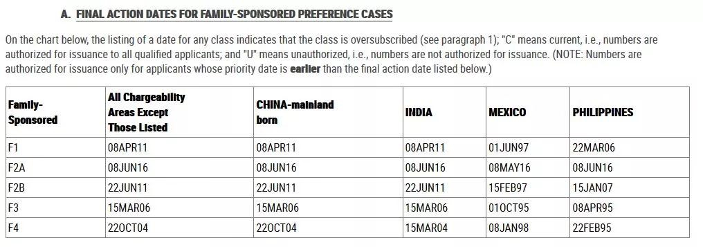 大陆出生的排期,表B中的F2A本月维持不变,其他几类缓慢前进: