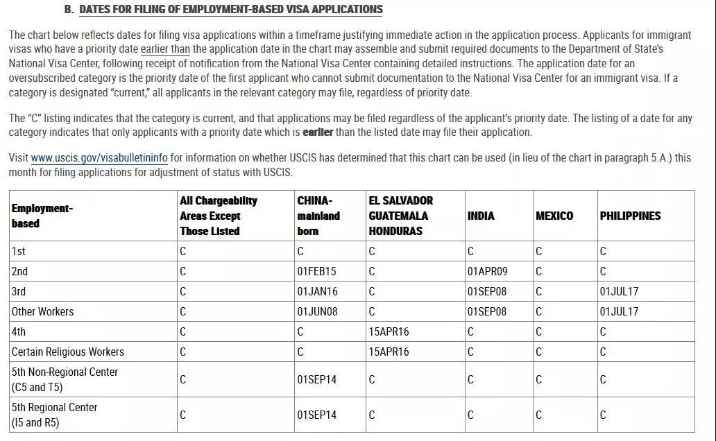 大家主要看中国大陆出生(CHINA-mainland born)的数据,也就是表里的第二列的数据。吐槽:中国大陆的排期之长仅次于印度。当然吐槽只限于职业排期,亲属排期的表里墨西哥和菲律宾的数据才叫绝望呢,有的刚排到95年。