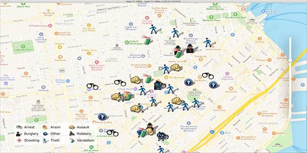 2. SpotCrime:地图上会显示犯罪记录,红色的靶心代表附近有枪击案,蓝色代表有盗窃案,火苗代表有纵火案。这些地图都是根据警方消息与新闻而整理出的,可以大概了解哪些地区的犯罪率比较高。