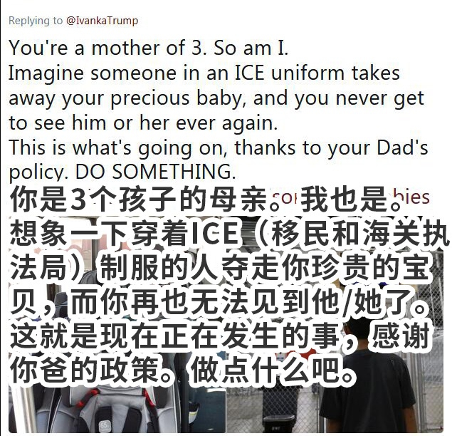 推特截图下同熟悉伊万卡的人都知道,她是个三天两头就会“晒娃”的人。但在这个节骨眼上,这张照片就显得有些“不合时宜”了。反对新政策的网友自然也不会放过机会,迅速在推文下对她发起了“围攻”。