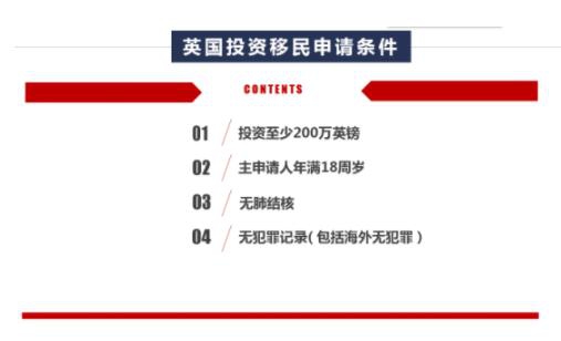 英国投资移民签证Tier 1 Investor visa最早开始于1994年。英国投资移民签证对投资者没有语言、学历、年龄和经商背景的要求。英国投资移民的申请条件简单,最低投资额为200万英镑,审批周期快,获批后30天内入境领取BRP卡,3个月内完成投资即可。首次申请英国200万英镑投资移民T1签证,可获得有效期最长为3年4个月的签证,下一次续签为2年,可无限次续签。持有英国投资移民T1签证满5年,满足条件可申请英国永居居留权,6年可申请入籍。
