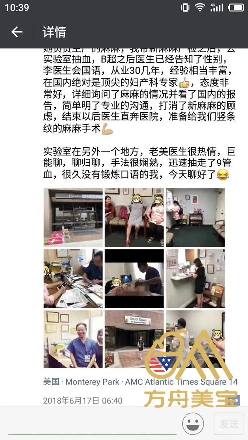 我们赴美生子项目经理已经到达美国啦!不定期给大家更新!记录忙碌的一上午:今天预约了李医生给新入住麻麻产检,穿竖条纹的麻麻今天发动,医生检查完就入院准备生产,我和管家兵分两路,她负责生产的麻麻,我带新麻麻产检之后,去实验室抽血,B超之后医生已经告知了性别,李医生会国语,从业30几年,经验相当丰富,在国内绝对是顶尖的妇产科专家,态度非常好,详细询问了麻麻的情况并看了国内的报告,简单明了专业的沟通,打消了新麻麻的顾虑,结束以后医生直奔医院,准备给我们竖条纹的麻麻手术。