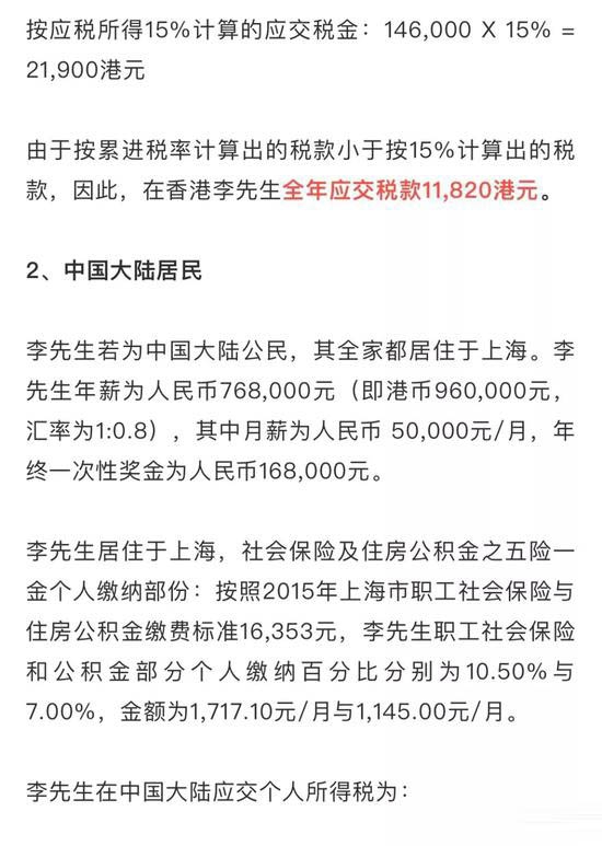 ◆ 香港的李先生一年缴纳的所得税是:1.18万,大陆的李先生缴纳的所得税是:20.6万。