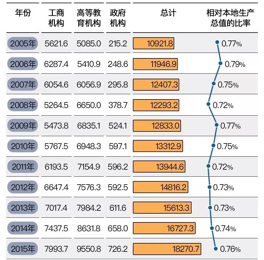 在科技研发的投入上面来看,研发投入远远没赶上GDP增长的速度。2005年,全港工商机构、高等教育机构和政府的研发支出总计109.2亿港币,占本地生产总值的0.77%,而到了2015年,研发开支182.7亿港币,但是占本地生产总值的比例却降到了0.76%,而这十年间,最低的比例0.72%,而最高并没有超过0.8%。