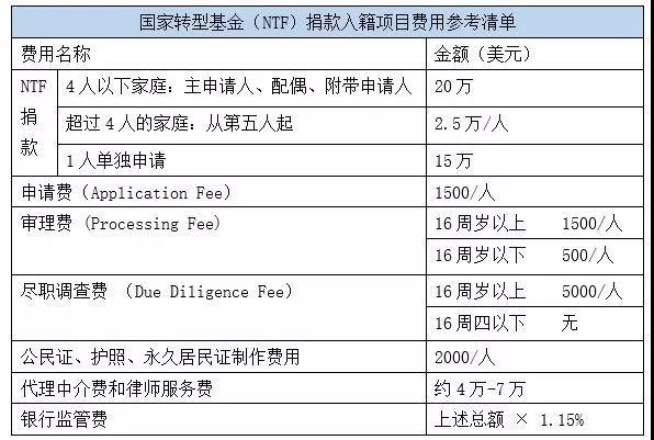 如果申请人选择向格林纳达国家转型基金(NTF)捐款,费率参考下表: