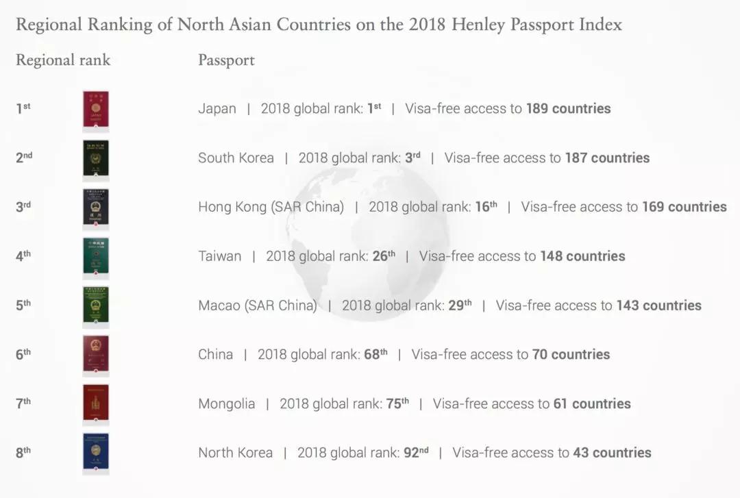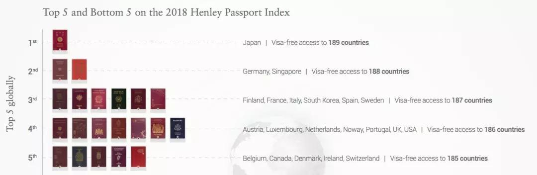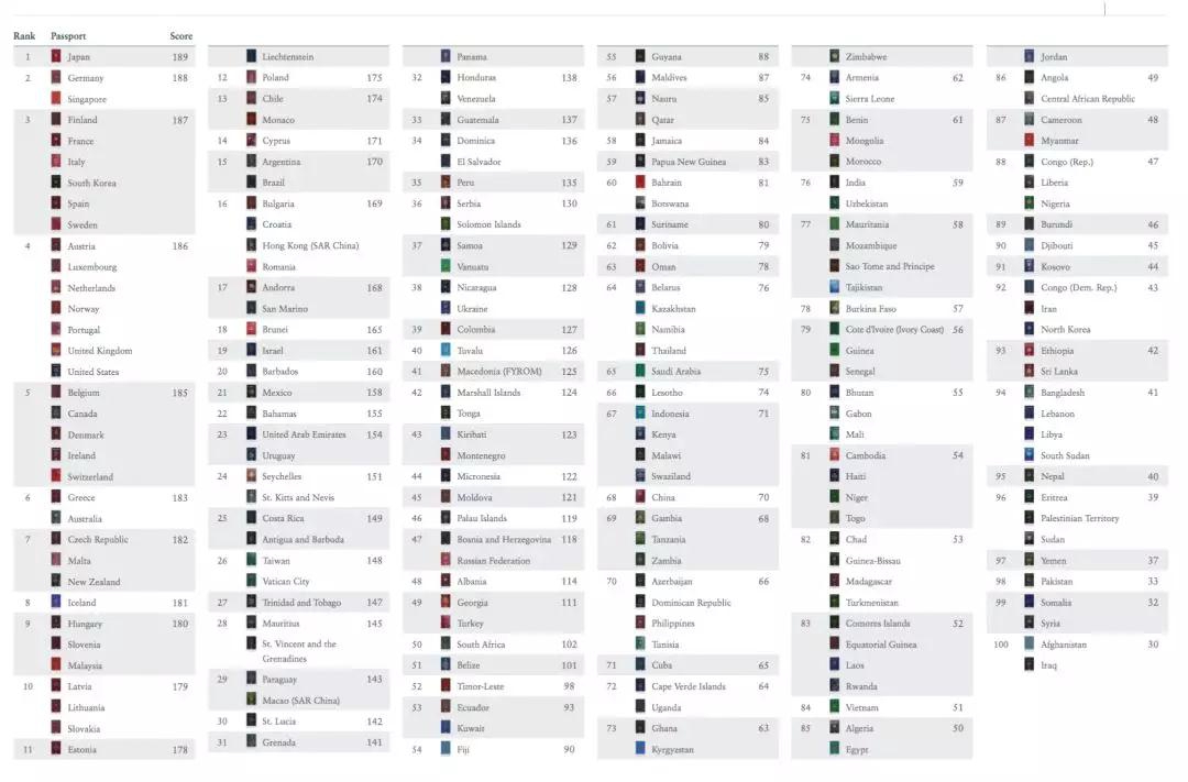Henley Passport Index护照排名指数参照国际航空运输协会(IATA)数据,根据各国护照免签国数量,对各国护照好使度进行排名。结果显示,日本护照免签国数量高达189个,居全球护照首位。