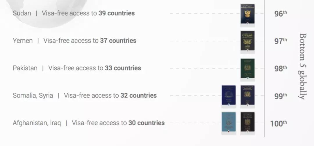 排名垫底的是伊拉克和阿富汗,免签国仅30个。其它排名垫底的还有索马里、叙利亚、巴基斯坦和也门等。俄罗斯护照排名下降,从上次的45名下降2个排名至47位。