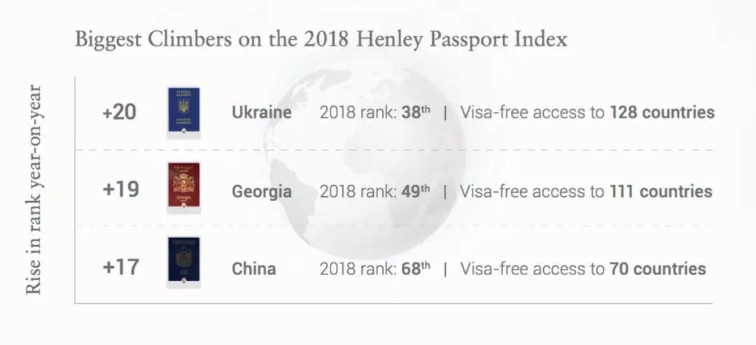 中国排名第68,免签70个国家,但是增长排名第三: