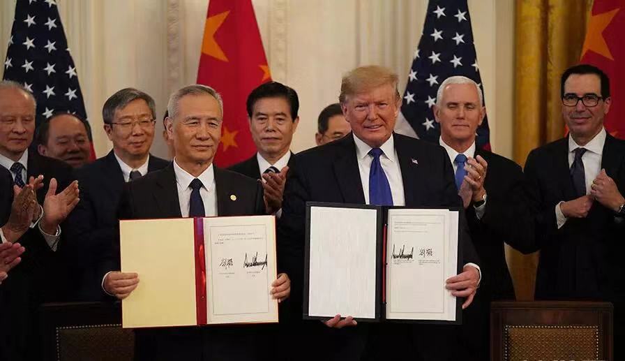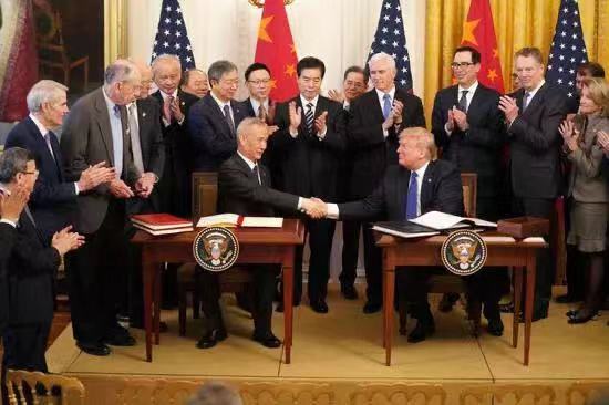 当地时间1月15日,中共中央政治局委员、国务院副总理、中美全面经济对话中方牵头人刘鹤与美国总统正式签署中美第一阶段经贸协议。