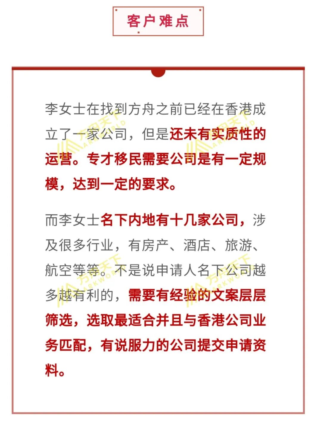 一般情况下,专才因为涉及很多公司上的文件,补件3-4次是很正常。而李女士的案子在资料上的准备是非常齐全的,鉴于之前专才移民的成功经验,文案同事将之前踩过的坑都一一避免了,这是0补件的最重要的原因。 还有一点是方舟做的商业计划书非常的有亮点,虽然李女士的香港公司还没有达到一定的运营规模,但是还是得到了香港入境处的认可。对于申请专才找雇主: