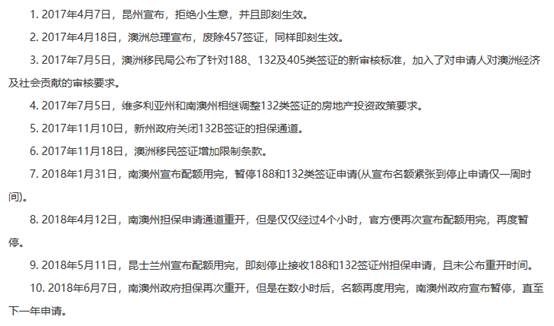 类似的事件曾在今年重复上演,而且有愈演愈烈之势。年初,南澳暂时关闭188/132类提名申请;年中,昆州和维州关闭了州担保申请;而就在今天,新州发出了它的第一个暂停申请通知。这些事件都在预示着一件事:澳洲变政在即,投资类移民或将提高申请条件以及后续投资要求!