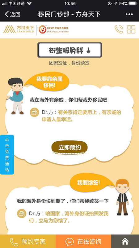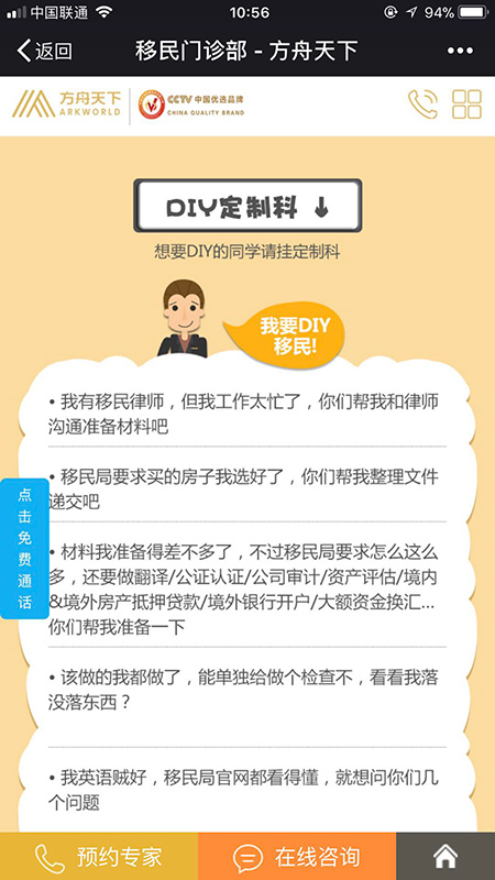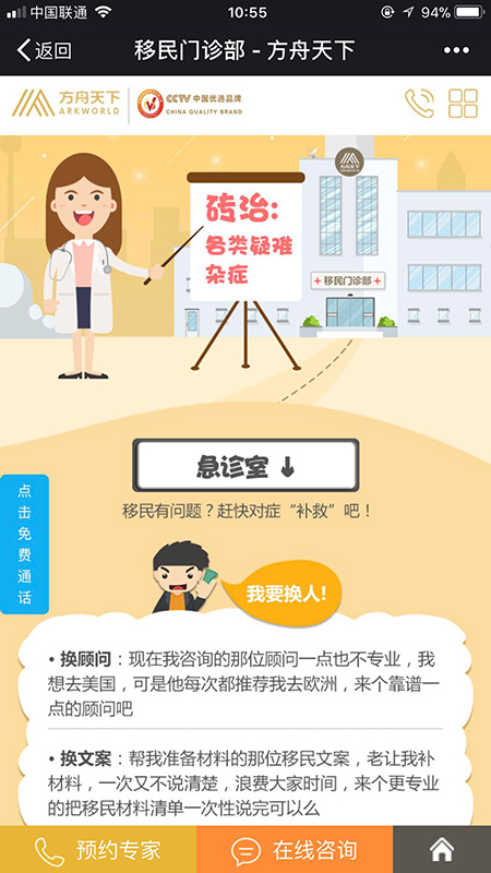 三个月后,方舟天下官网上线了“移民门诊”栏目,在这个栏目下面分别有“移民急诊室”、“衍生服务科”和“DIY订制科”三个板块,并放言“专治疑难杂症”。